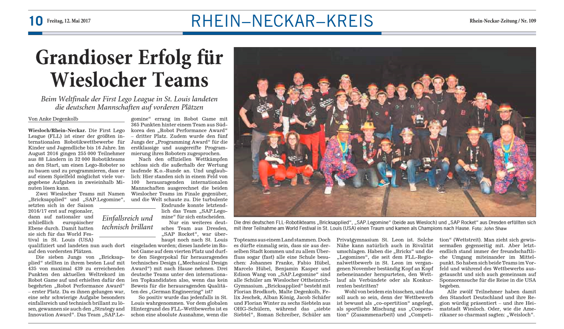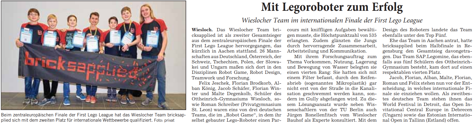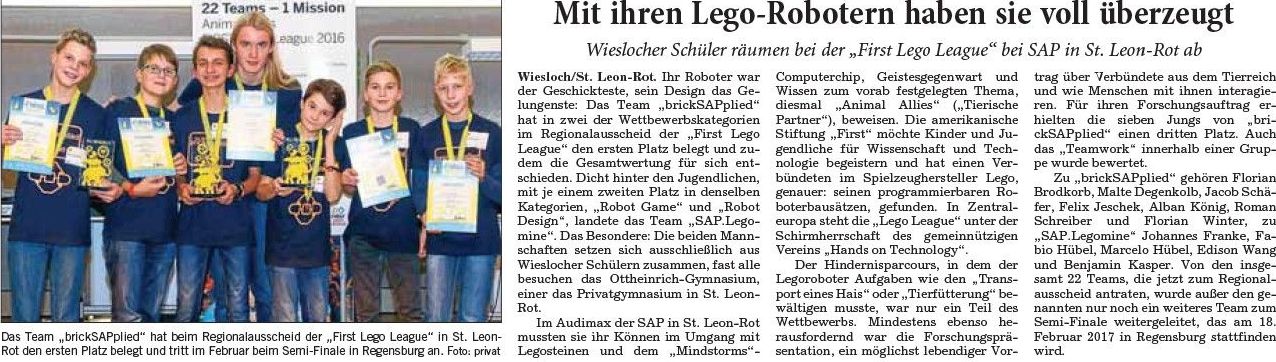 In der Saison 2016/17 Animal Allies erreichten wir mit der Teilnahme am FLL World Festival, einem Internationalen Wettbewerb in den USA, die höchste Wettbewerbsstufe. Dort stellten wir in einer Kategorie, dem Robot-Game, den Weltrekord auf und erhielten den Stategy and Innovation Award, First Place.